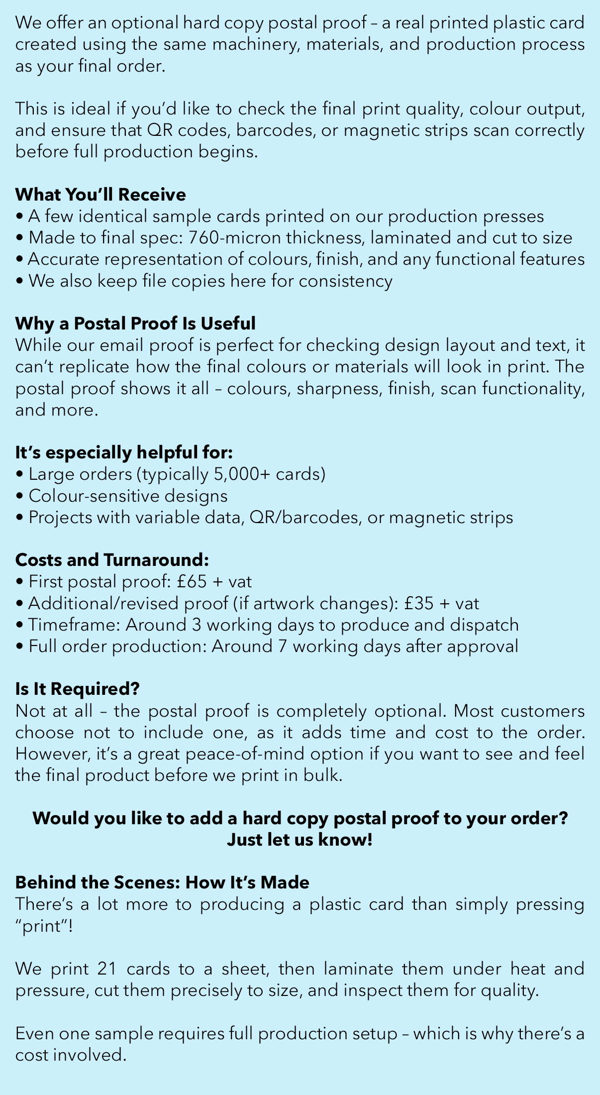 If you’d like to see exactly how your card design will look and feel before we proceed with your full order, we can print a real plastic card from your artwork and post it to you for approval.