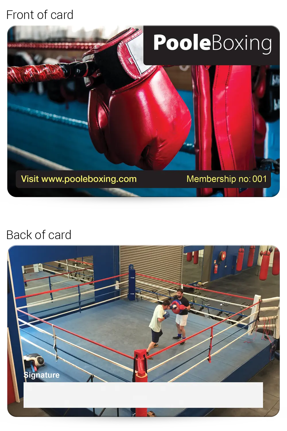 This realistic mock-up shows how your finished Boxing Club membership cards will look, so you can check and approve the layout, text and overall design before production begins.
