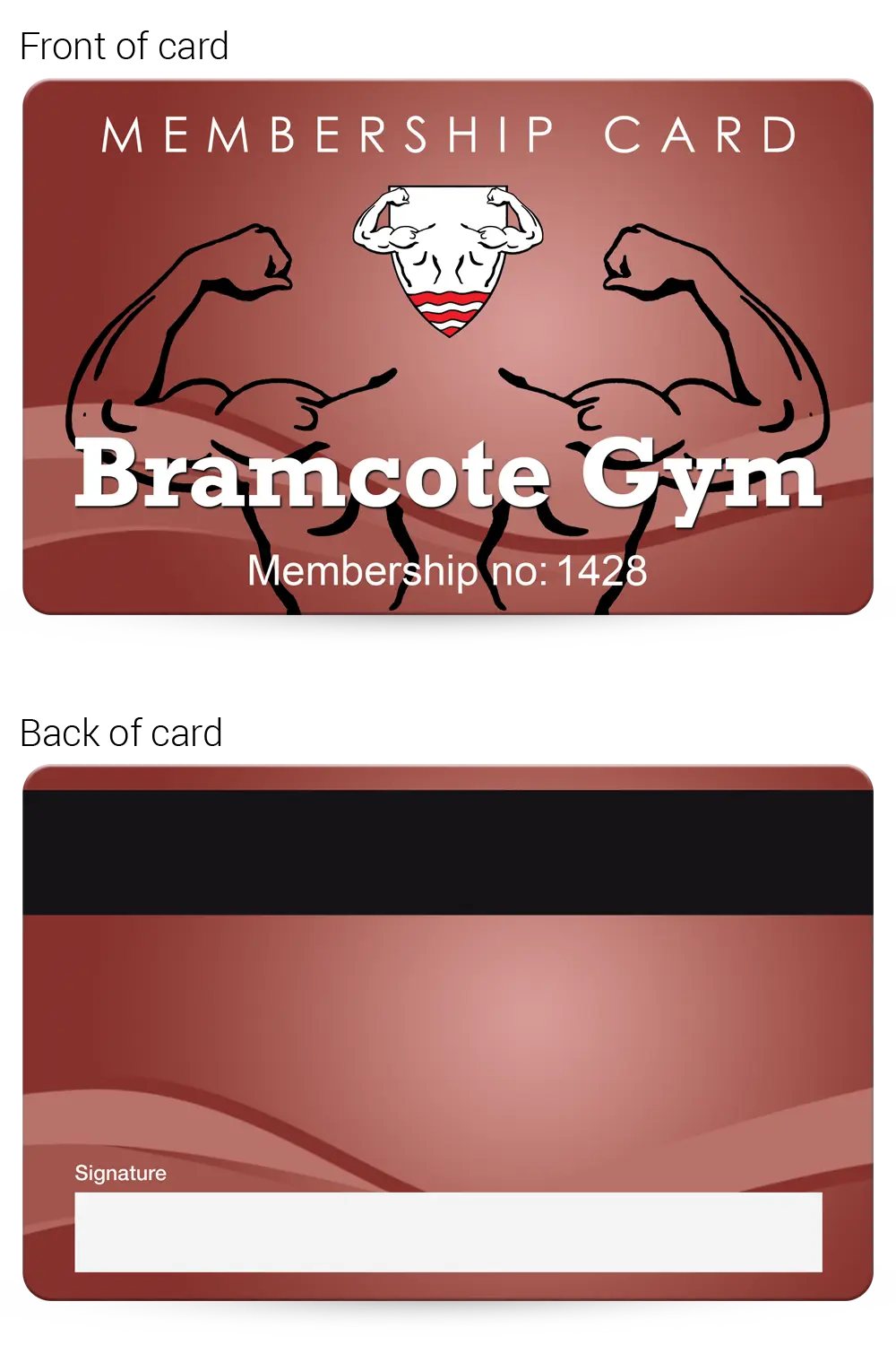 This realistic mock-up shows how your finished Gym membership cards will look, so you can check and approve the layout, text and overall design before production begins.