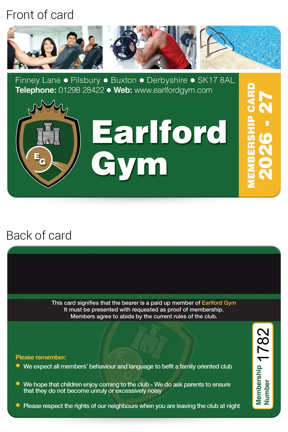 We have lots of Gym Membership Card examples that you are welcome to base your design on, complete with your logo and any photographs that you supply, just email them over for no extra cost!