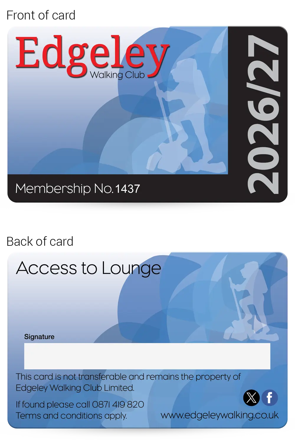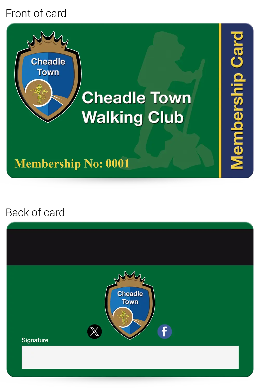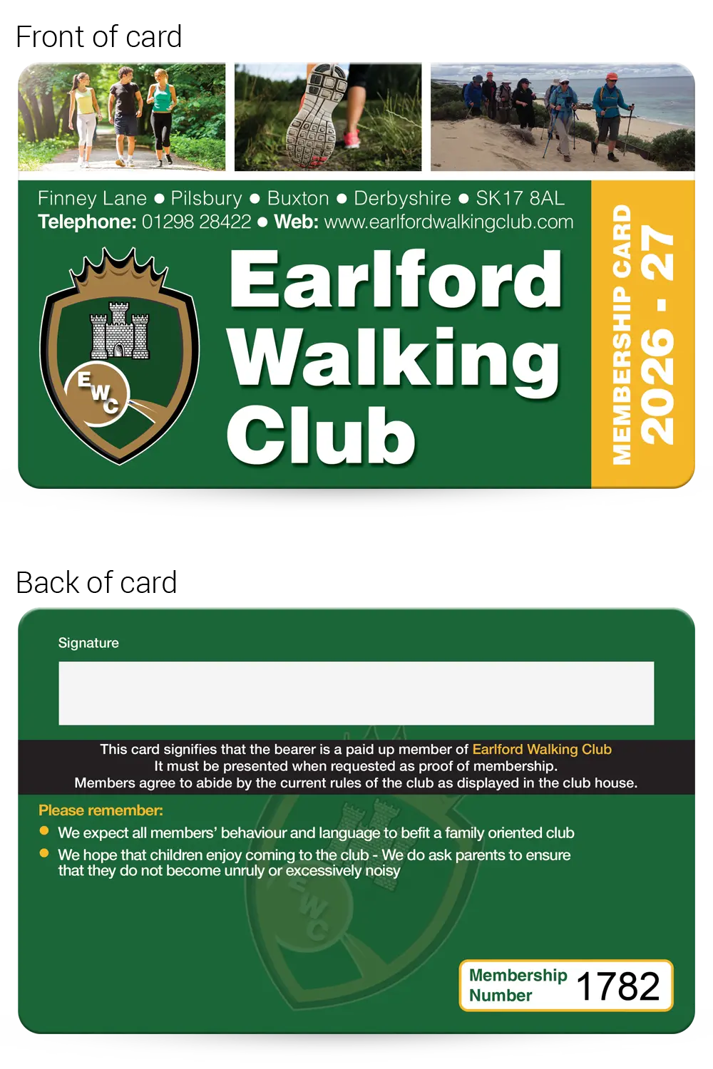 We have lots of Walking Club Membership Card examples that you are welcome to base your design on, complete with your logo and any photographs that you supply, just email them over for no extra cost!