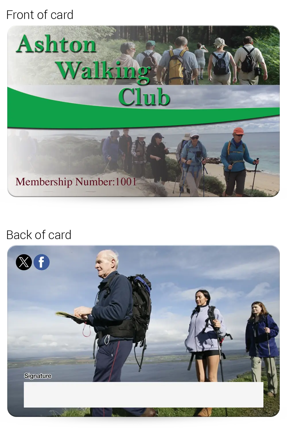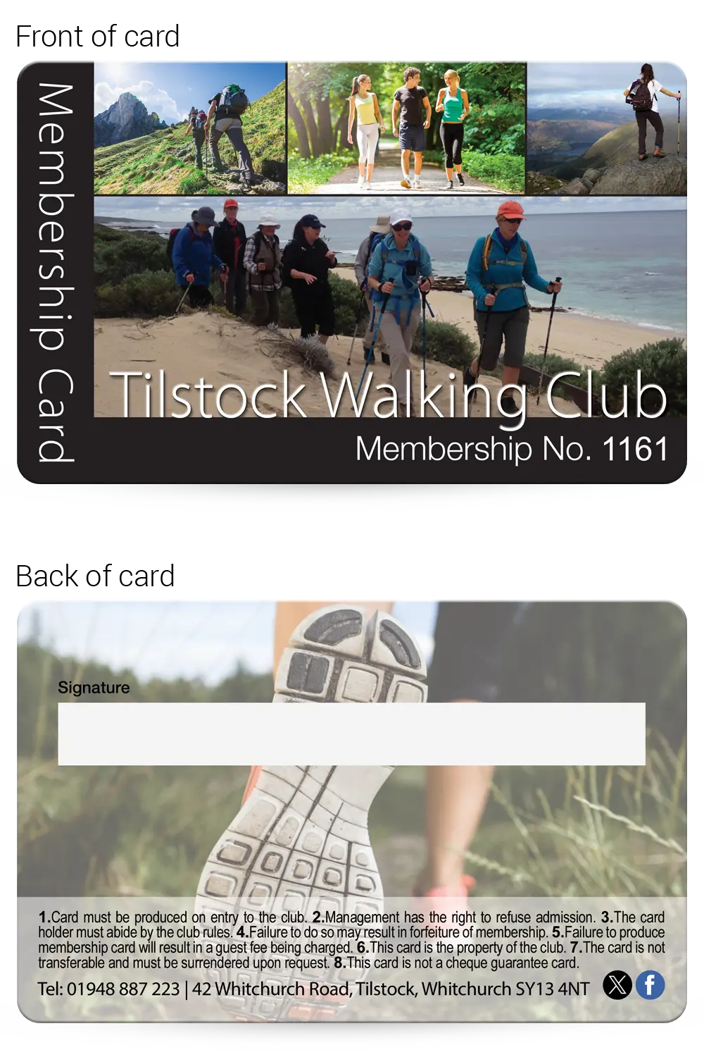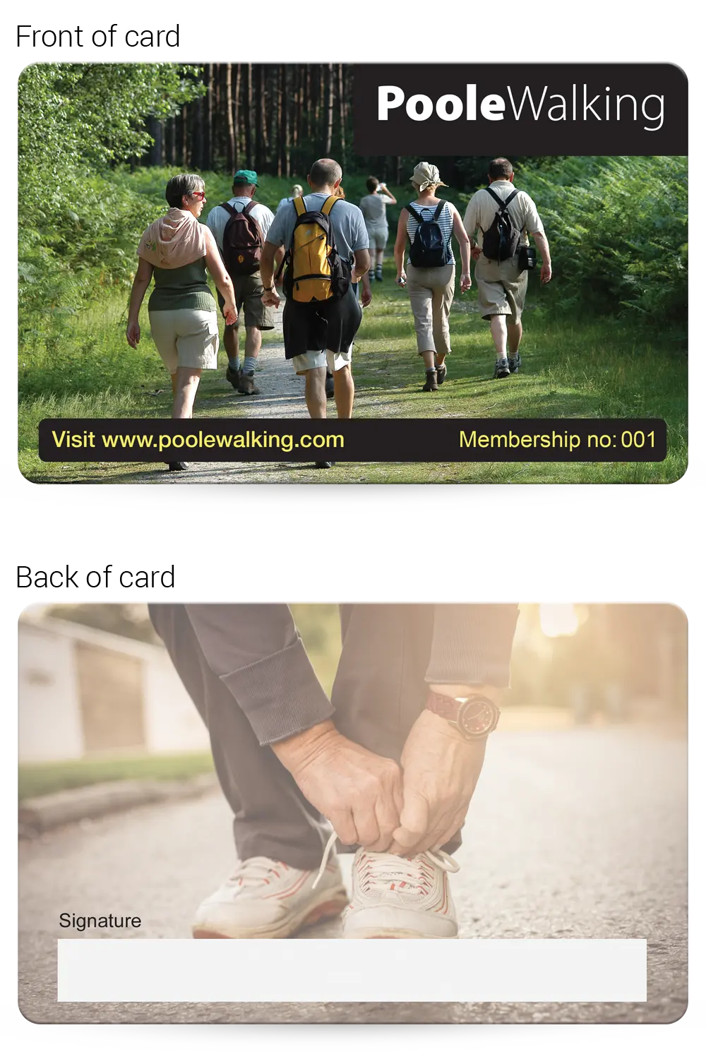 We can print high quality, professional, full colour PVC plastic membership cards for your Walking club.