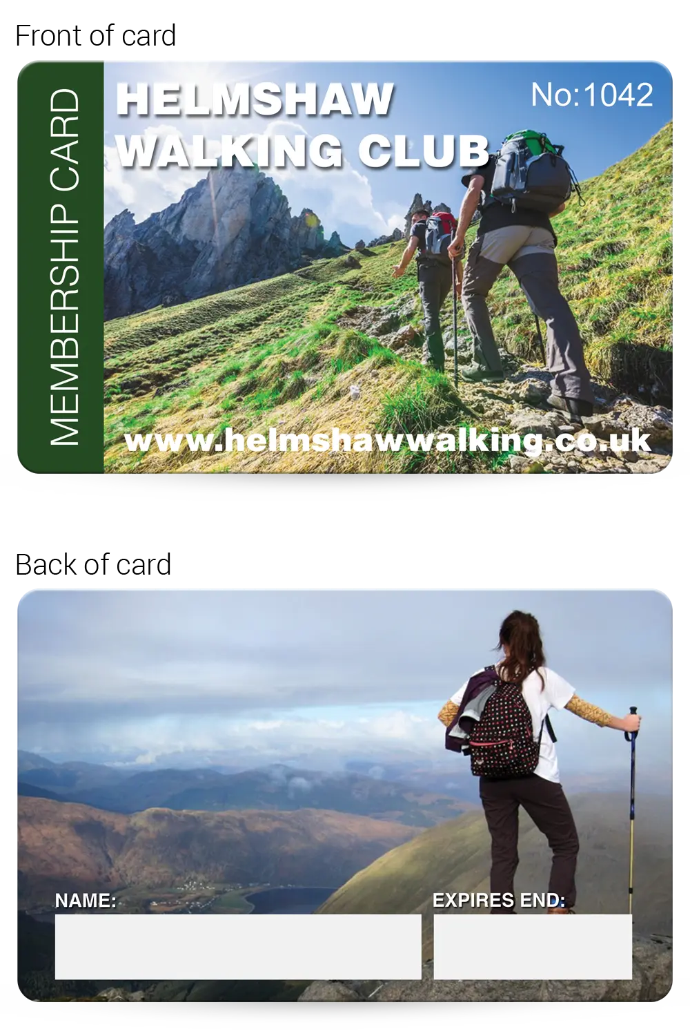 This realistic mock-up shows how your finished Walking or Hiking Club membership cards will look, so you can check and approve the layout, text and overall design before production begins.